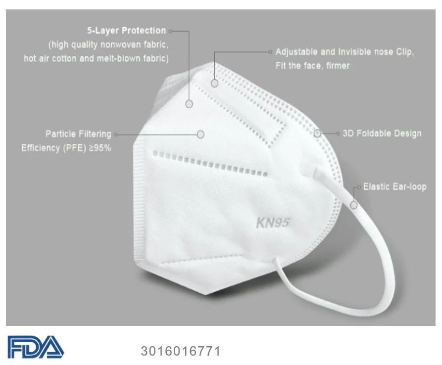 Five-layer foldable KN95 masks provide up to 95% filtration efficiency against non-oil based airborne particles as small as 0.3 microns. They are ideal for everyday use to help in the prevention of germ spread and to protect individuals from airborne particles, viruses, pollen, and various allergens.